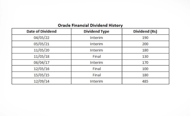 In the last five years, Oracle Financial's dividend payout and dividend yield have averaged 76% and 4.4%, respectively.