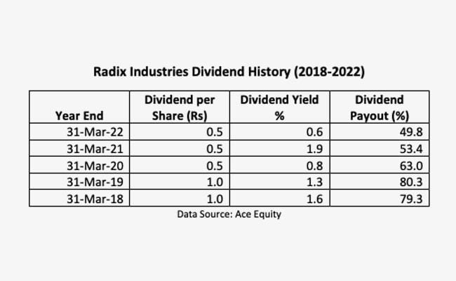 Why does Radix make it to the list? The company's five year average dividend payout ratio comes to 65.2% with an average payout per share of Rs 0.7 per year.