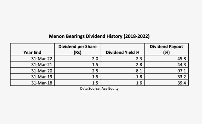 Menon Bearings' five-year average dividend payout ratio comes to 52%. Its payout per share comes to Rs 1.8 per year.