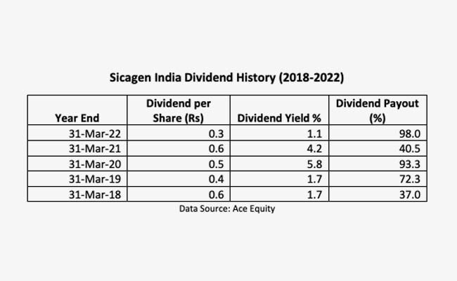 Why does Sicagen India make it to the list? The company's five year average dividend payout ratio comes to 68.2% with an average payout per share of Rs 0.5 per year.