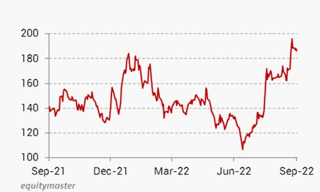 The stock has surged 14 per cent in a year due to a jump in the sales volume of the company. It is currently trading 6 per cent away from its 52-week high.