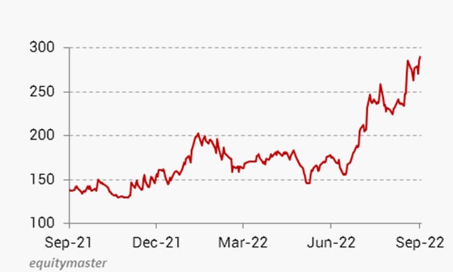 The stock has given a 110x return over the past year. It is currently trading 4 per cent away from its 52-week high of Rs 302.6.