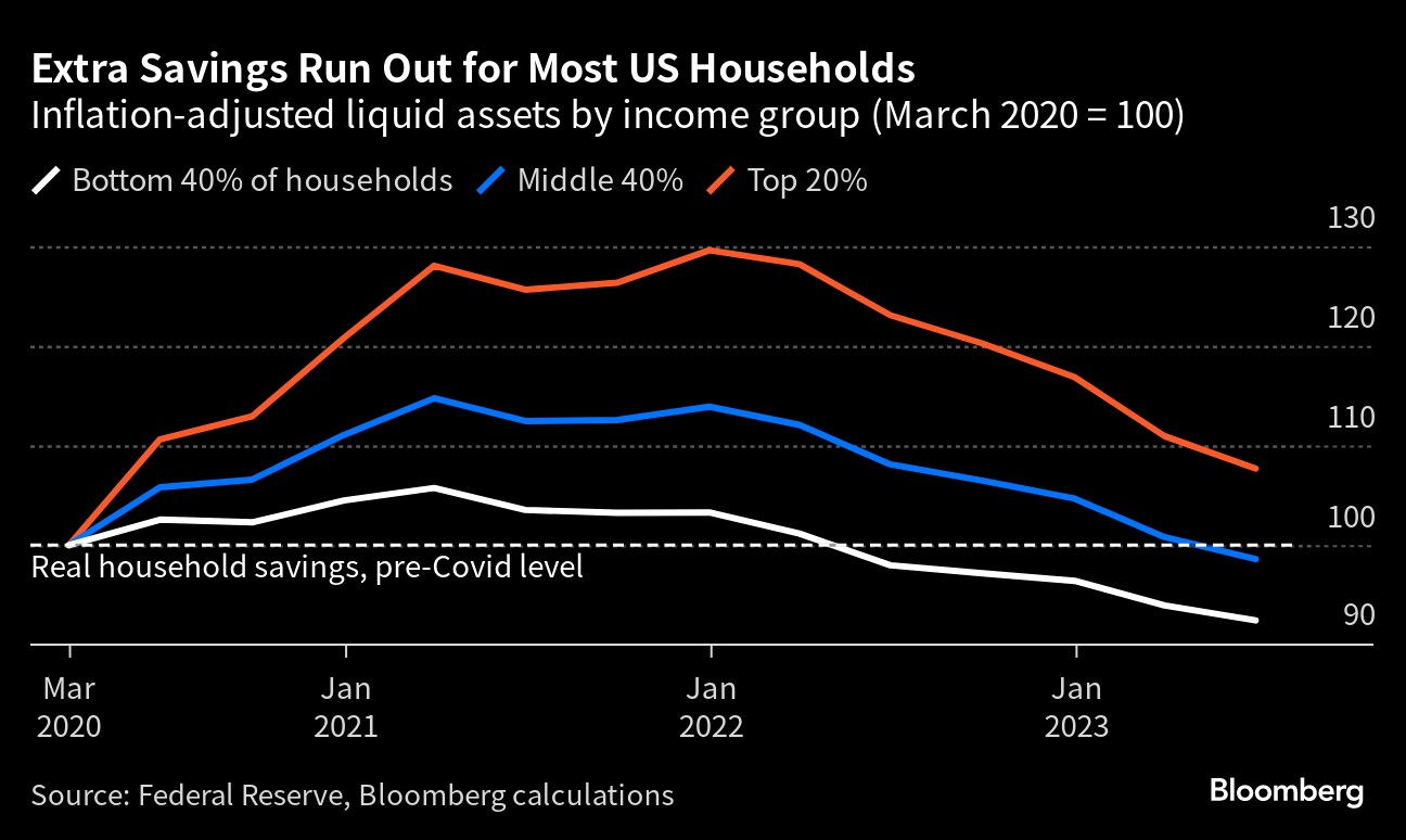 What's more, the extra savings that Americans amassed in the pandemic — thanks to stimulus checks and lockdowns — are running out. There's a debate over how fast, but the San Francisco Fed calculated that they'd all gone by the end of September. Bloomberg calculations show that the poorest 80% of the population now have less cash on hand than they did before Covid.