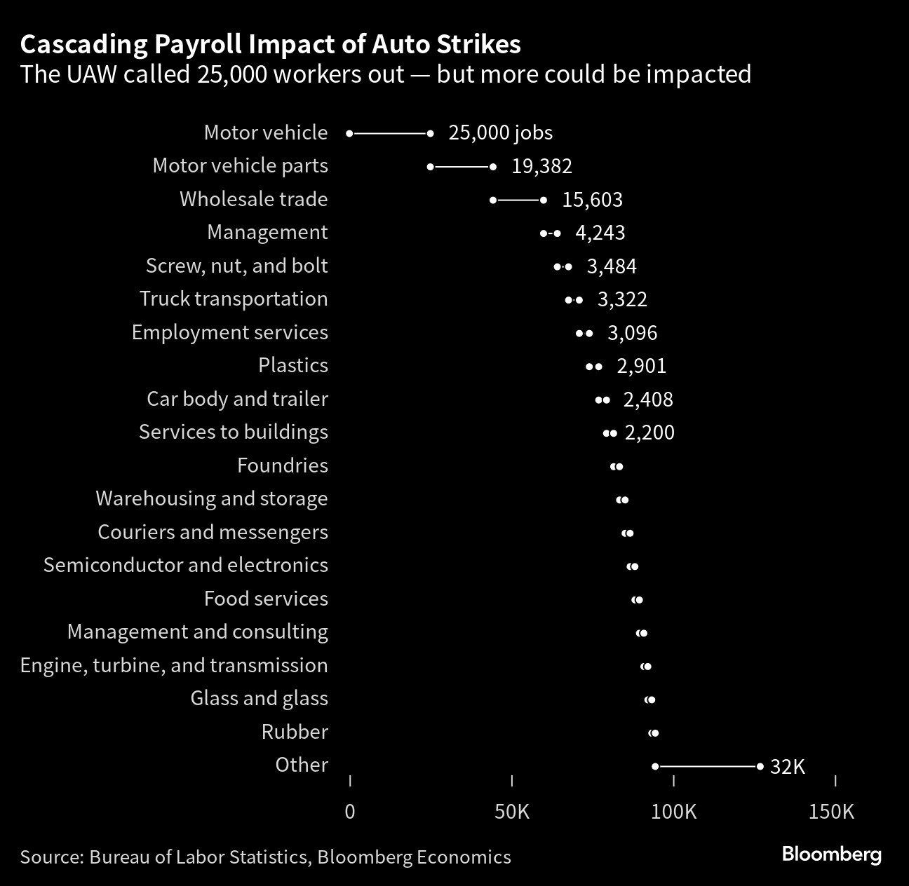 - Auto Strike: The United Auto Workers union has called a walkout at America's Big Three auto firms, the first time they've all been targeted at the same time. It expanded the strike on Friday to encompass some 25,000 workers. The industry's long supply chains means stoppages can have an outsize impact. In 1998, a 54-day strike of 9,200 workers at GM triggered a 150,000 drop in employment.