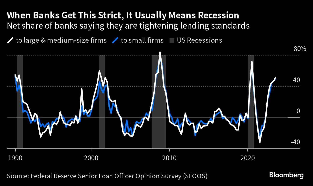 The latest reading shows that about half of large and mid-sized banks are imposing tougher criteria for commercial and industrial loans. Aside from the pandemic period, that's the highest share since the 2008 financial crisis. The impact is set to be felt in the fourth quarter of this year – and when businesses can't borrow as easily, it usually leads to weaker investment and hiring.