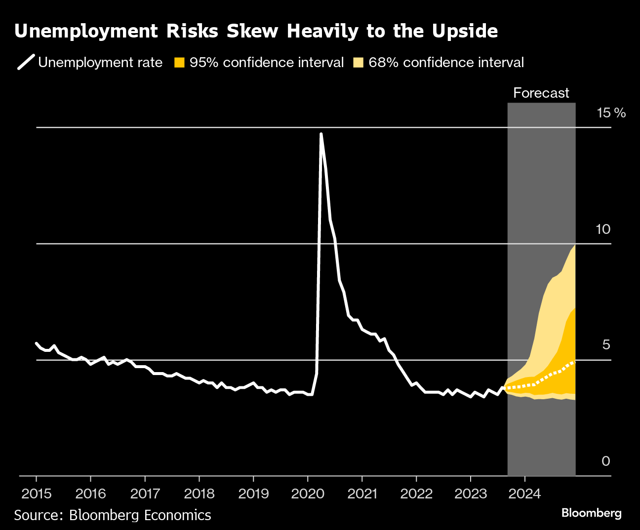 But what if there's a break in the trend — the type of sudden shift that occurs when the economy goes into a dive? Using a model designed to allow for these nonlinearities, Bloomberg Economics has forecast not just the most likely path for the unemployment rate, but the distribution of risks around that path.