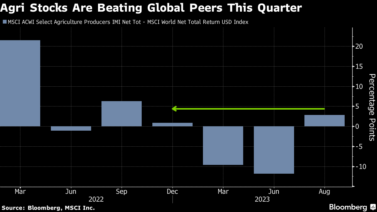 An index tracking total returns from select agricultural producers has outperformed the broader MCSI World Index by about three percentage points since the start of July, data compiled by Bloomberg show. The industry has outperformed as a gauge of food commodity prices posted its biggest gain in 16 months last month.