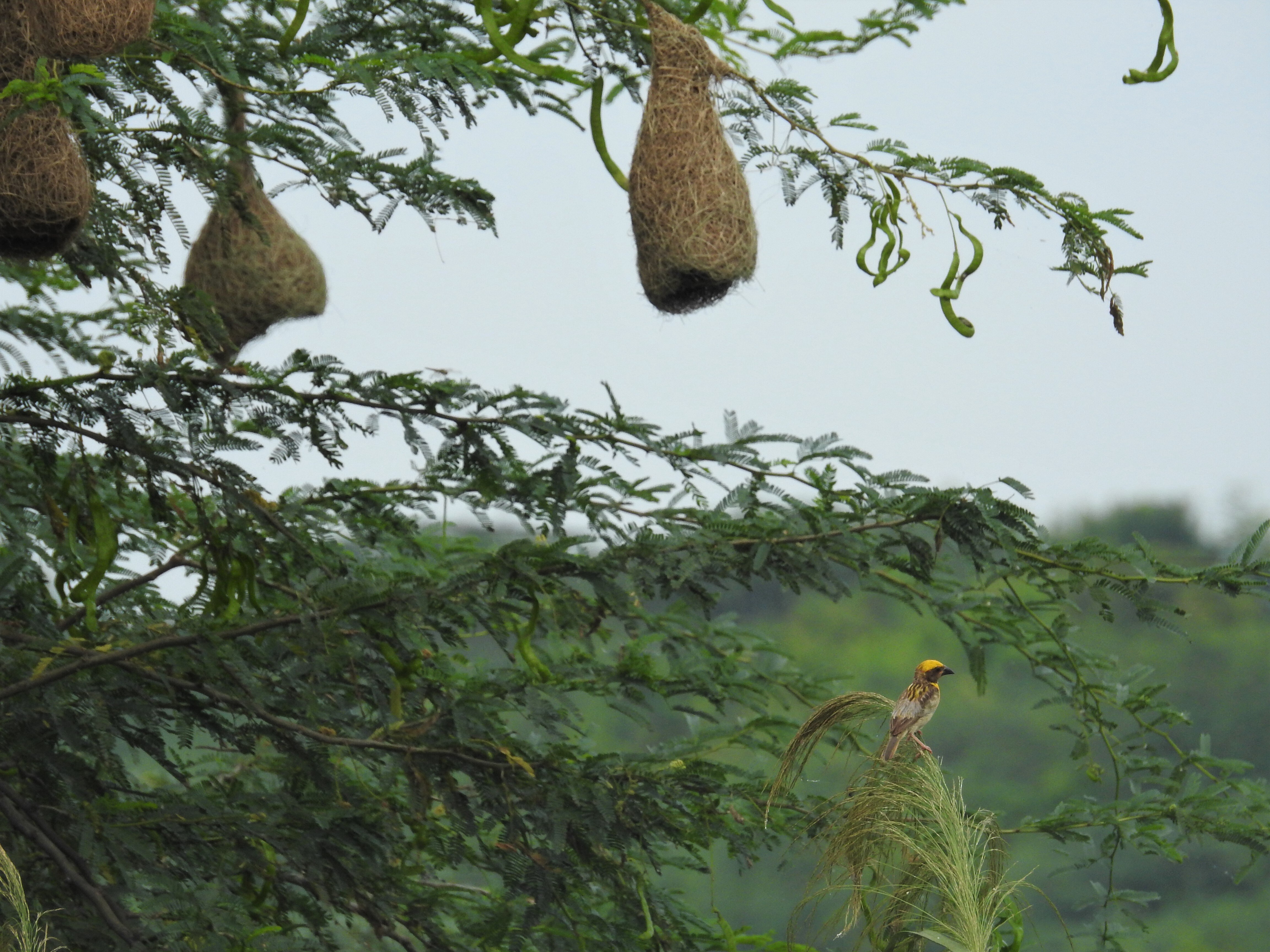 This bird-built architecture is an iconic marker of the Indian countryside. A single tree may have many weaver bird nests; as more than one bird may settle in the same tree. The trees they choose are usually thorny, to prevent predators. The male has patches of bright yellow during the monsoon— decked specially in breeding plumage (he will be brown at other times of the year). He is often spotted sitting on a frond of grass. Monsoonal winds make the plants sway, and his bright-yellow body flickers like lights in the green-and-gold grasses. According to traditional ecological knowledge, a suite of baya weaver nests means that water is nearby. Most often, the bayas choose trees that are spiny and next to a water body—this is another level of protection from predators.