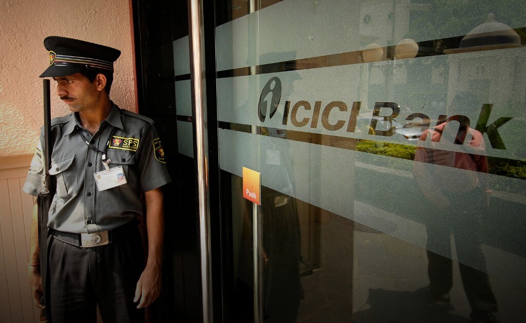A security guard stands outside the door of an ICICI Bank branch in Mumbai, India. (Photographer: Abhijit Bhatlekar/Bloomberg News)