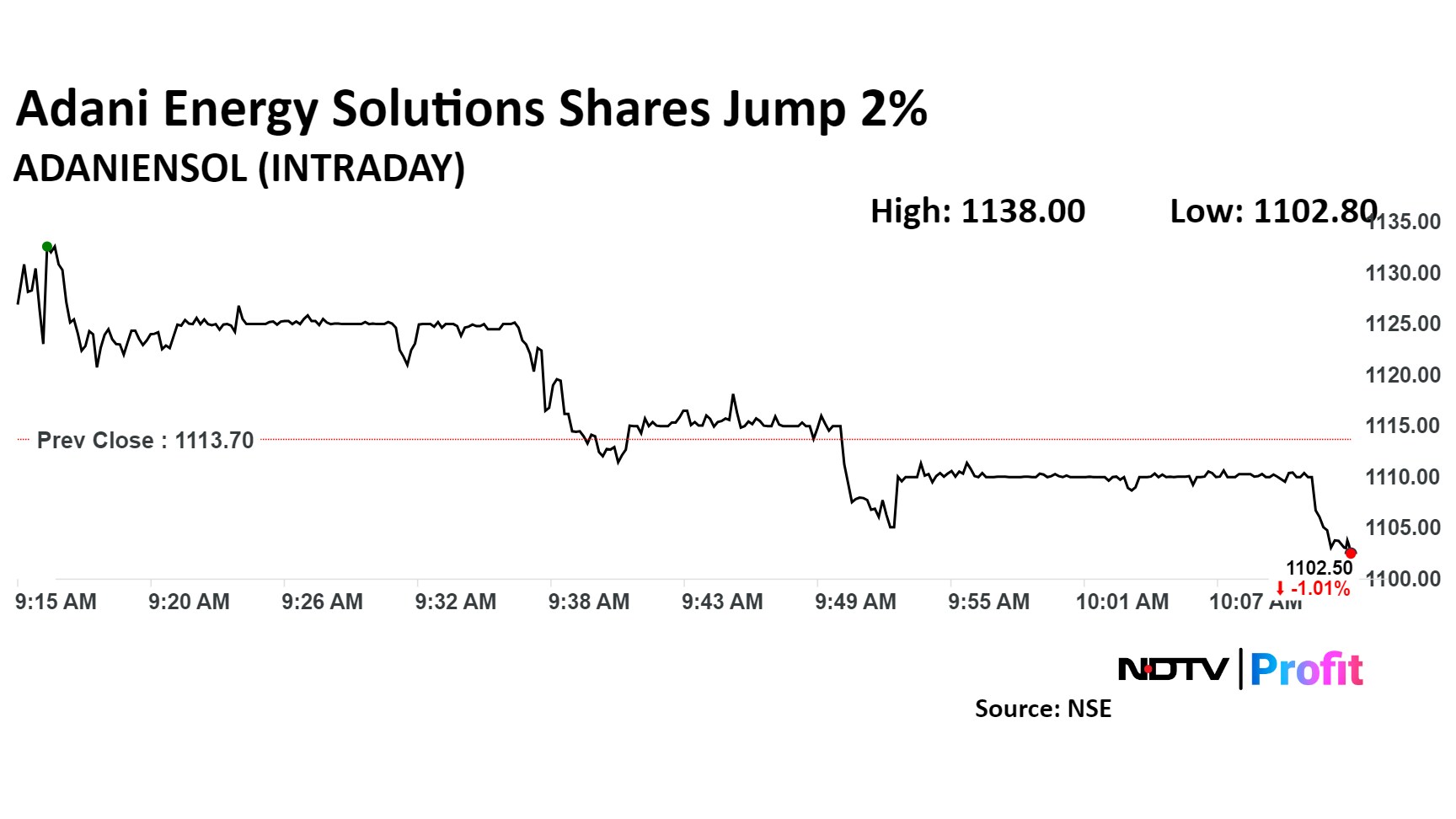 Shares of the company rose as much as 2.18% to Rs 1,138 apiece, the highest level since Aug. 7. It pared gains to trade 0.30% lower at Rs 1,110 apiece, as of 10:10 a.m. This compares to a 0.63% advance in the NSE Nifty 50 Index.