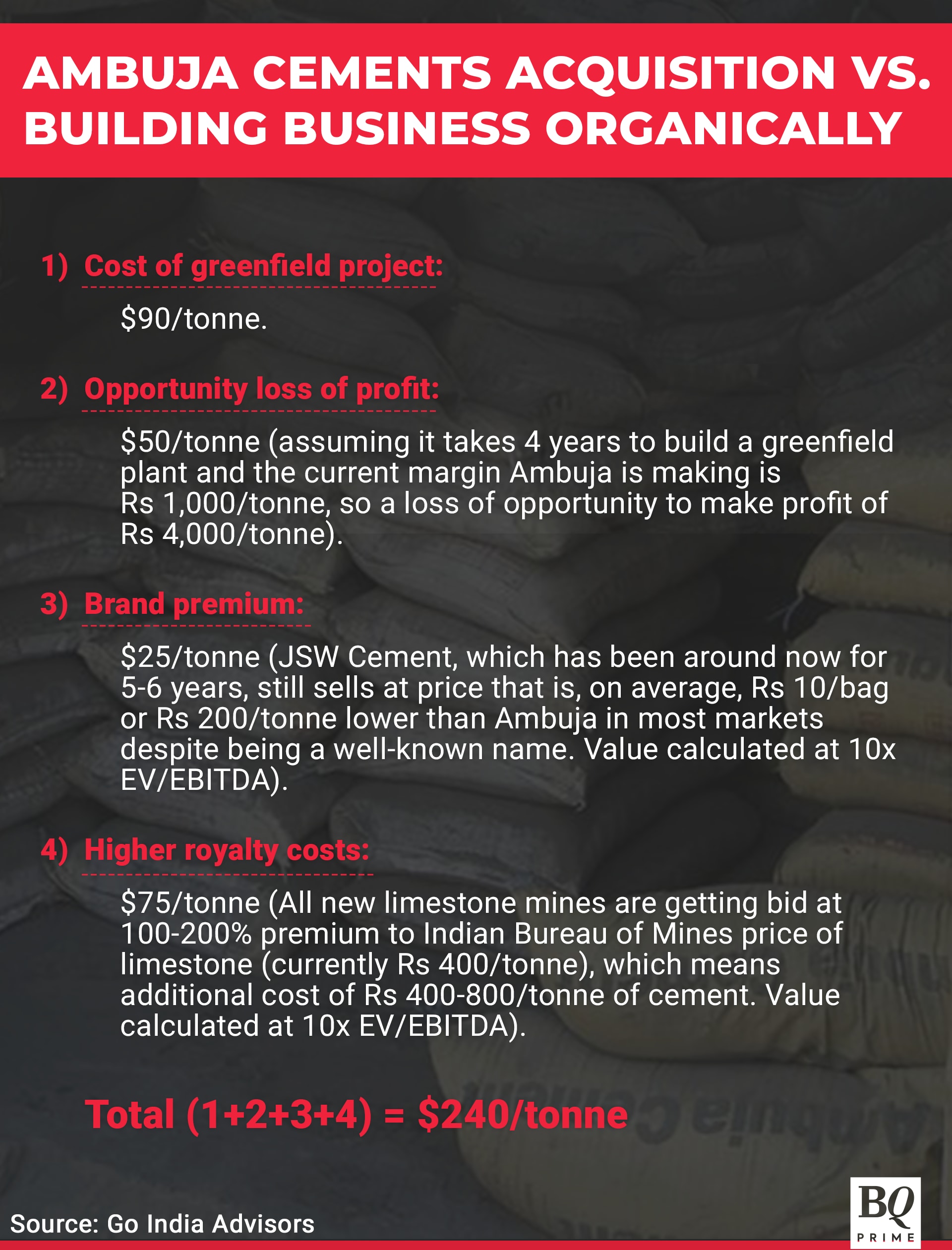 Replacement costs stand at $90/tonne, and the deal has been done at almost 2x that. Does it mean that a large control premium has been paid and there is no upside left? Well, we don't think so. In fact, building a greenfield project at $90/tonne is equal to buying Ambuja at upwards of $200/tonne due to the high royalty costs on new limestone mines and a strong brand premium.