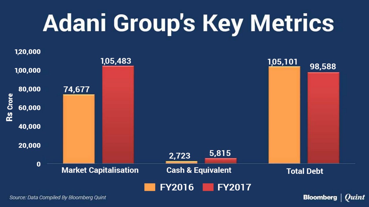 Adani Group companies' market capitalisation rose 41 percent to Rs 1.05 lakh crore in the year ended March. Its cash and cash equivalents doubled to Rs 5,815 crore. Debt remains the biggest concern and fell marginally to Rs 98,588 crore ($15 billion) in the year ended March.