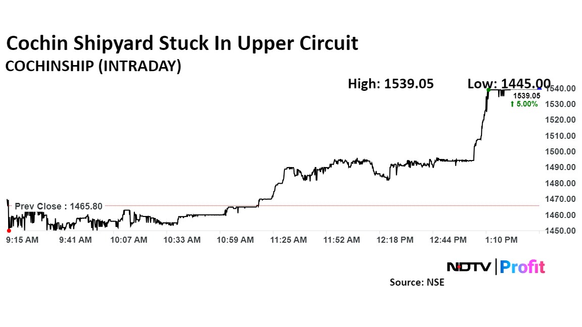 Shares of Cochin Shipyard were stuck in an upper circuit on Friday after the company received an order from Adani Ports The order by Adani Ports is the largest ever for eight harbour tugs under the Make In India scheme.