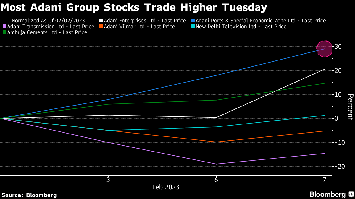 Eight of the 10 group stocks were higher on Tuesday. Adani Enterprises' rally came after the stock tumbled by more than half since the explosive report.