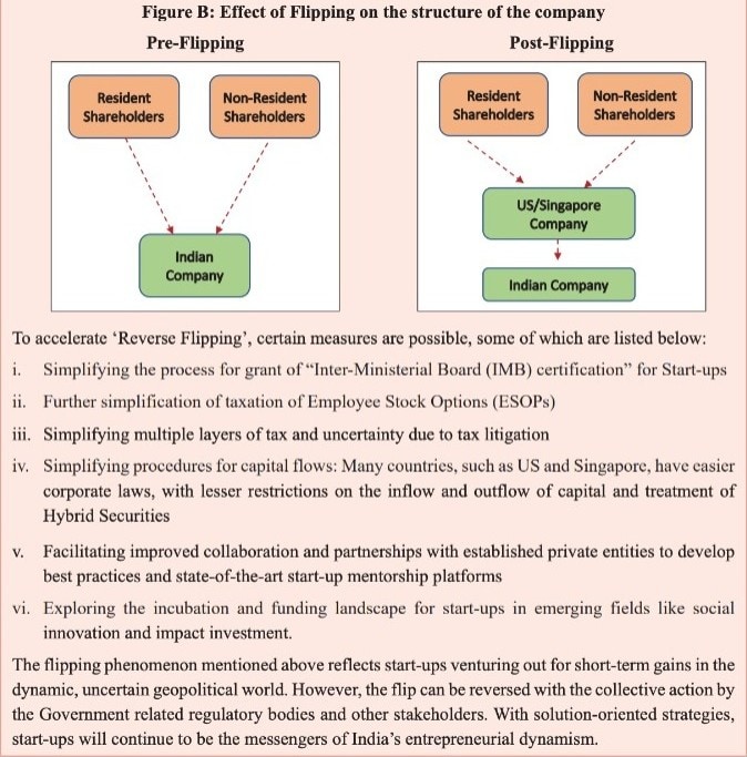 Many Indian startups are domiciled outside India despite having the majority of their market, personnel, and founders in India, it said. "These 'externalised' or 'flipped' startups constitute a large number of India's unicorns."
