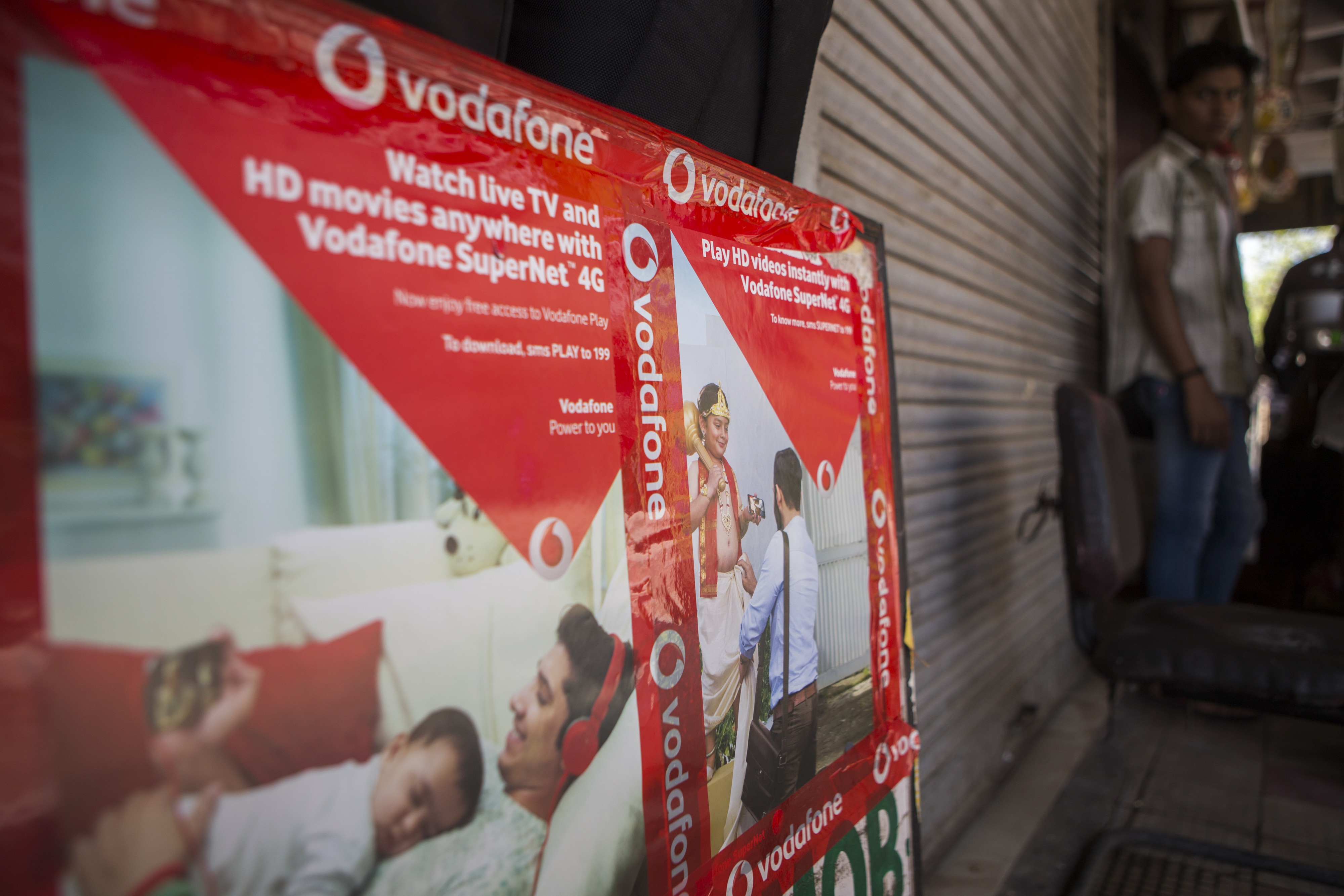 An advertisement for Vodafone India Ltd. is displayed on the wall of a tea vendor’s stall in New Delhi (Photographer: Prashanth Vishwanathan/Bloomberg)