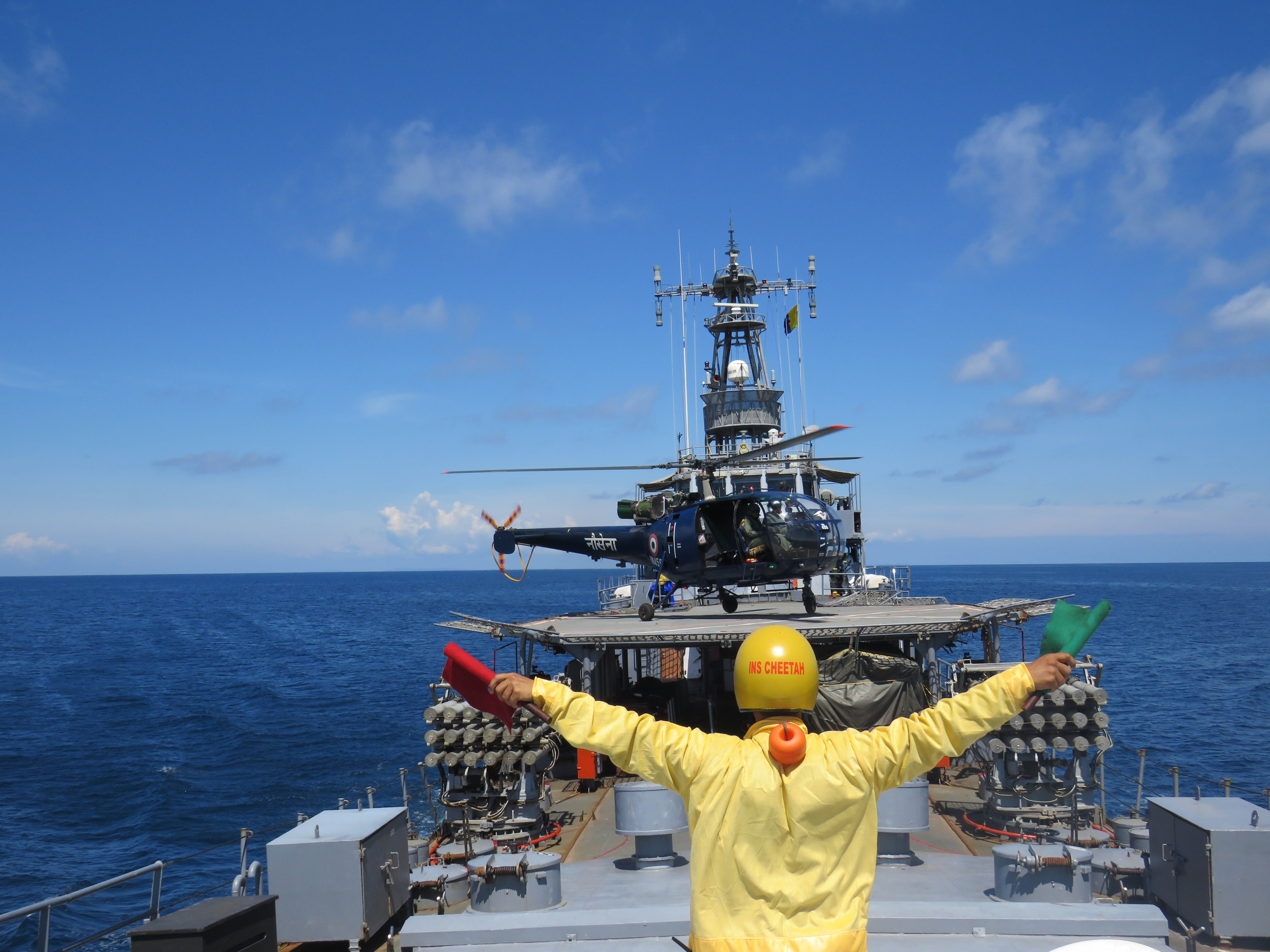 A naval officer directs a helicopter landing on the INS Cheetah. (Photograph: PIB)