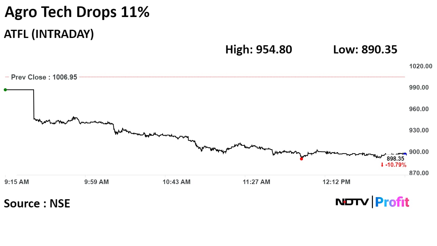 Shares of Agro Tech tumbled 10.92% to Rs 897 apiece, compared with 1.49% rise in the benchmark Nifty 50.