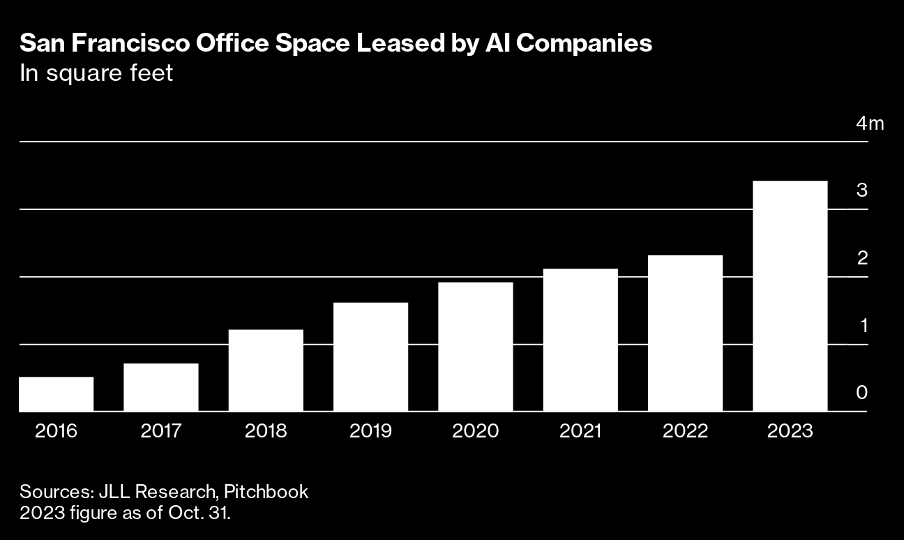 Artificial intelligence companies apparently haven't gotten the memo. They're flocking to San Francisco, and many are asking workers to show up in person most of the time. The city's office vacancy rate reached a record 34% in the third quarter, according to the real estate brokerage CBRE Group Inc., yet AI companies have signed deals for more than 1 million square feet of San Francisco office space so far this year. That brings the industry's total footprint to 3.4 million square feet, according to the real estate services company Jones Lang LaSalle Inc., up from 2.3 million square feet last year and seven times what it was in 2016.