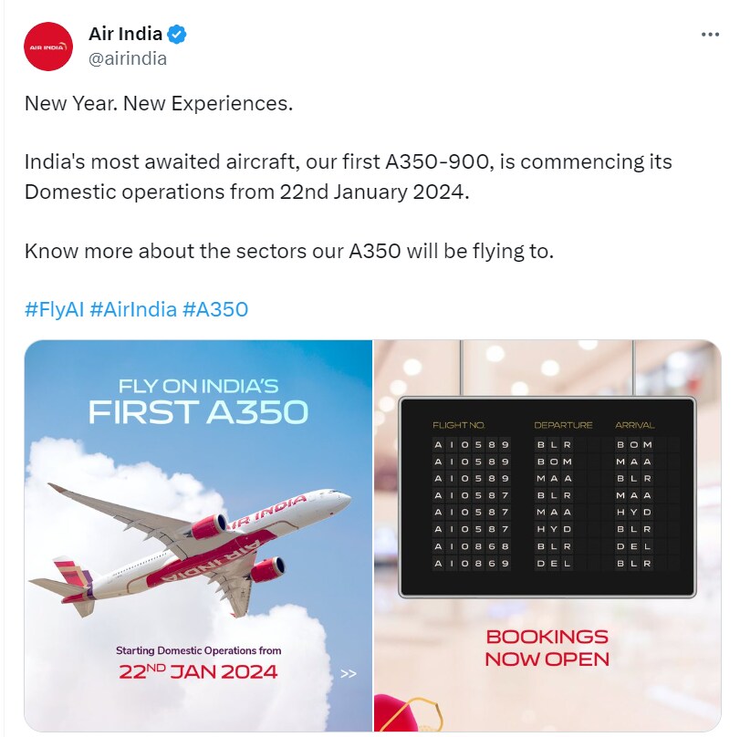 Tata Group-owned Air India on Tuesday announced the commencement of their new Airbus A350-900 operations from January 22. The carrier has started bookings for the flights.