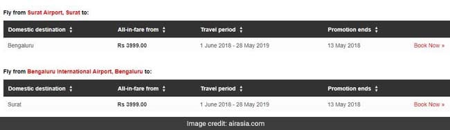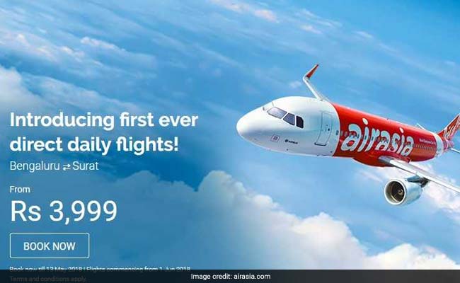 AirAsia is offering daily direct flights between metro city Bengaluru and Gujarat's diamond hub Surat. AirAsia's domestic flight tickets on Bengaluru to Surat route start from Rs 3,999, according to the airline's website, airasia.com. Customers can book until May 13, 2018 to avail this offer. The daily direct flights between Bengaluru and Surat and vice-versa will commence from June 1.