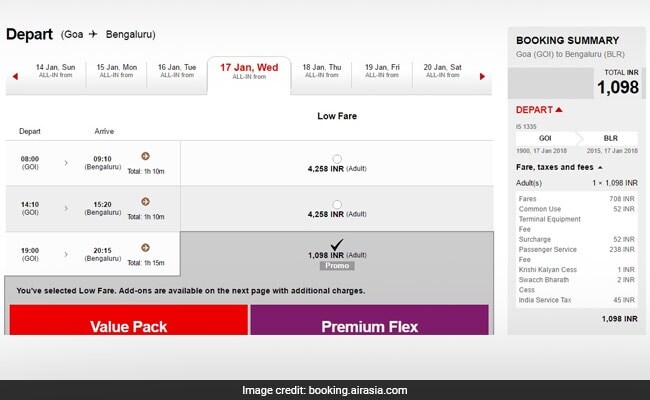 A search on the AirAsia India bookings portal showed tickets for a journey from Goa to Bengaluru in mid-January next year were being offered at Rs 1,098, which included fares, service tax, surcharge, Krishi Kalyan Cess and Swacch Bharath Cess.