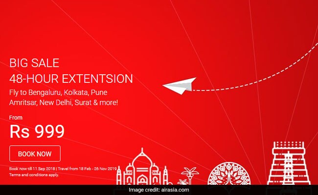 AirAsia India has announced 48-hour extension to its 'Big Sale' offer. After the extension, the flight offer is available till September 11, 2018. Under this scheme, flight tickets are available at a starting all-inclusive price of Rs 999. The travel period of the offer starts on February 18, 2019 and ends on November 26, 2019, said the carrier on its official website- airasia.com. AirAsia India is available on flights flying to Bengaluru, New Delhi, Surat, and many more. Advance booking is required in order to avail the benefits of the offer, said AirAsia India.