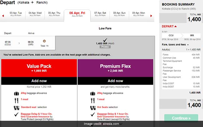 AirAsia India is offering flight tickets at a starting price of Rs 1,399 on flights between Bhubaneshwar to Kolkata, Ranchi to Kolkata, Kochi to Kolkata, Kolkata to Bhubaneshwar, Kolkata to Ranchi, Guwahati to Imphal, Hyderabad to Bengaluru, Imphal to Guwahati, Bengaluru to Kochi, Bengaluru to Hyderabad, Bengaluru to Chennai and Chennai to Bengaluru. A search on AirAsia India's portal showed one way flights from Kolkata to Ranchi were being offered at Rs 1,400 in April, 2018.