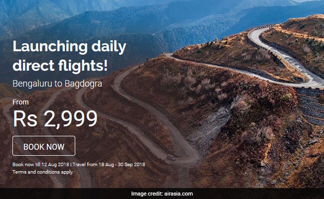 AirAsia India is introducing daily direct flights from Bengaluru to Bagdogra at an all-inclusive price of Rs 2,999, said the carrier on it's official website- airasia.com. The travel period of the new offer starts from August 18, 2018 and ends on September 30, 2018. In order to avail the scheme, bookings must be done till August 12, 2018, added the airline. In a separate offer, AirAsia is also offering up to 40 per cent discount on both domestic and international flight tickets.