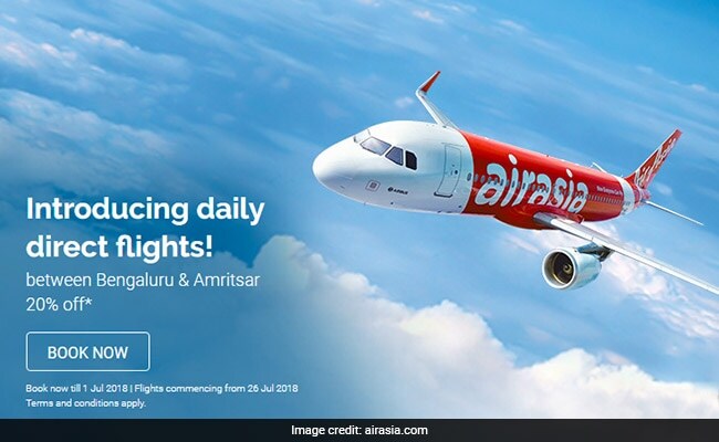 AirAsia India is offering 20 per cent discount on flight tickets between Bengaluru and Amritsar, said the airline on its official website -- airasia.com. The booking period to avail AirAsia's discounted offer is valid till July 1, 2018. Travel period for the discounted offer is valid from July 26 to November 30, 2018. Earlier this month, AirAsia had introduced direct flights on Bengaluru-Amritsar route on a daily basis from July 26. Earlier, AirAsia flight ticket prices for this route were starting from Rs 4,499. Several other airlines have come up with discount offers on both domestic and international flight tickets to woo passengers.