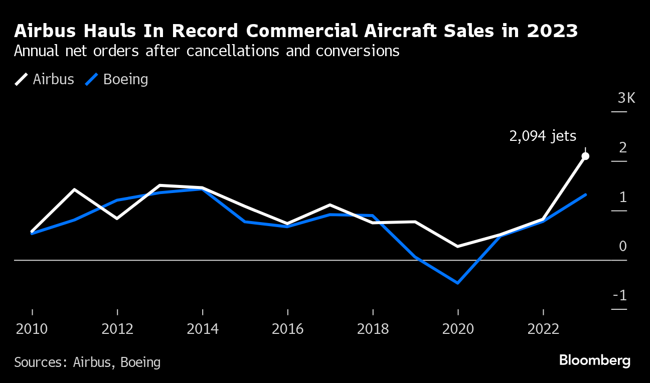 (Bloomberg) -- Airbus SE set a sales record in 2023 by racking up more than 2,000 net orders, as airlines splashed out on purchases amid surging demand for fuel-efficient aircraft following the pandemic.