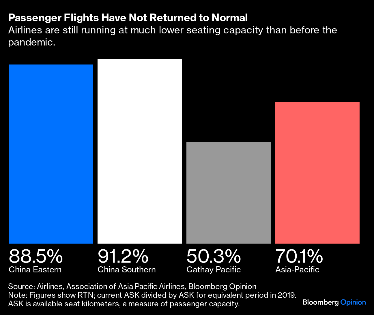 Across Asia, airlines are running at an average of just 70% RTN for the year through September, according to Bloomberg Opinion analysis based on data from the Association of Asia Pacific Airlines, whose members include Singapore Airlines Ltd., Cathay Pacific, Japan Airlines Co. and Taiwan's China Airlines Ltd. This means that even if airlines were running at a 100% load factor — full capacity — they're still operating 30% lower than before the pandemic.