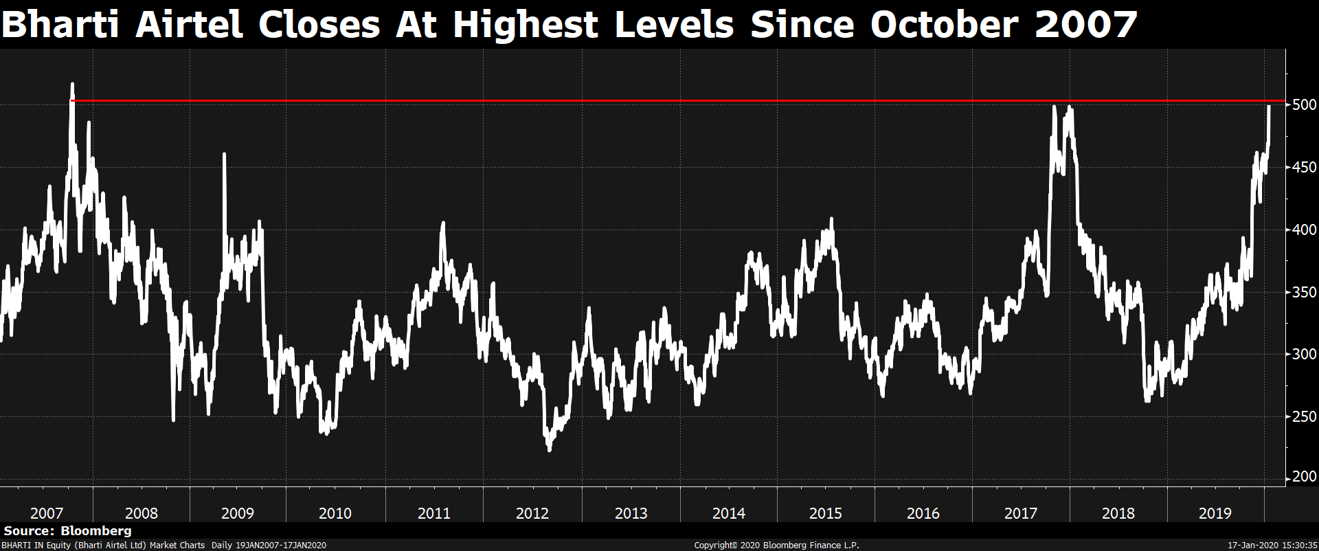 On Friday, the company's shares gained 6.31 percent over previous close to Rs 503.80 apiece—the highest since Oct. 17, 2007. Peer Vodafone Idea Ltd.'s stock fell as much as 39.2 percent intraday but pared some of the losses on a likely telecom relief from the government.