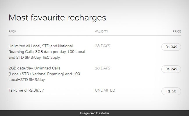Bharti Airtel is currently offering a bunch of prepaid recharge plans with different data and calling benefits. Among these, there are a few of the prepaid plans offered by the operator that are called as 'most favourite recharges', as mentioned on Airtel's official website- airtel.in. These prepaid recharge plans are priced at Rs 50, Rs 249 and Rs 349 and offers varied benefits. Airtel's Rs 50 plan is a talktime unlimited plan while Rs 249 and Rs 349 prepaid plans offer data, calling as well as SMS benefits for a definite period of time, said Airtel.