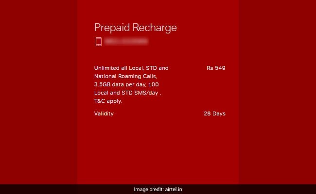 Airtel's revised prepaid recharge plan priced at Rs 549 offers a total of 98GBs of 3G/4G data for a period of 28 days with a daily cap of 3.5GB data. Unlimited local, STD and roaming voice calls are also bundled with this plan. Airtel's Rs 549 prepaid recharge plan also offers 100 free SMSes per day. The validity of the plan is 28 days.