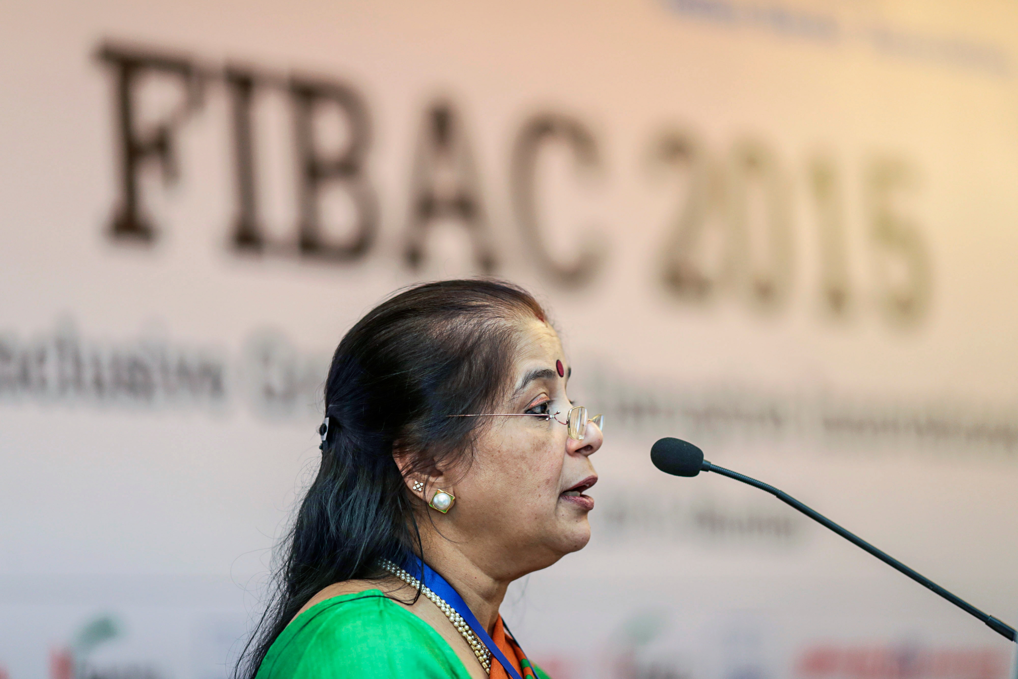 Usha Ananthasubramanian, former chief executive officer of Punjab National Bank, speaks during the FIBAC banking conference in Mumbai, India. (Photographer: Dhiraj Singh/Bloomberg)