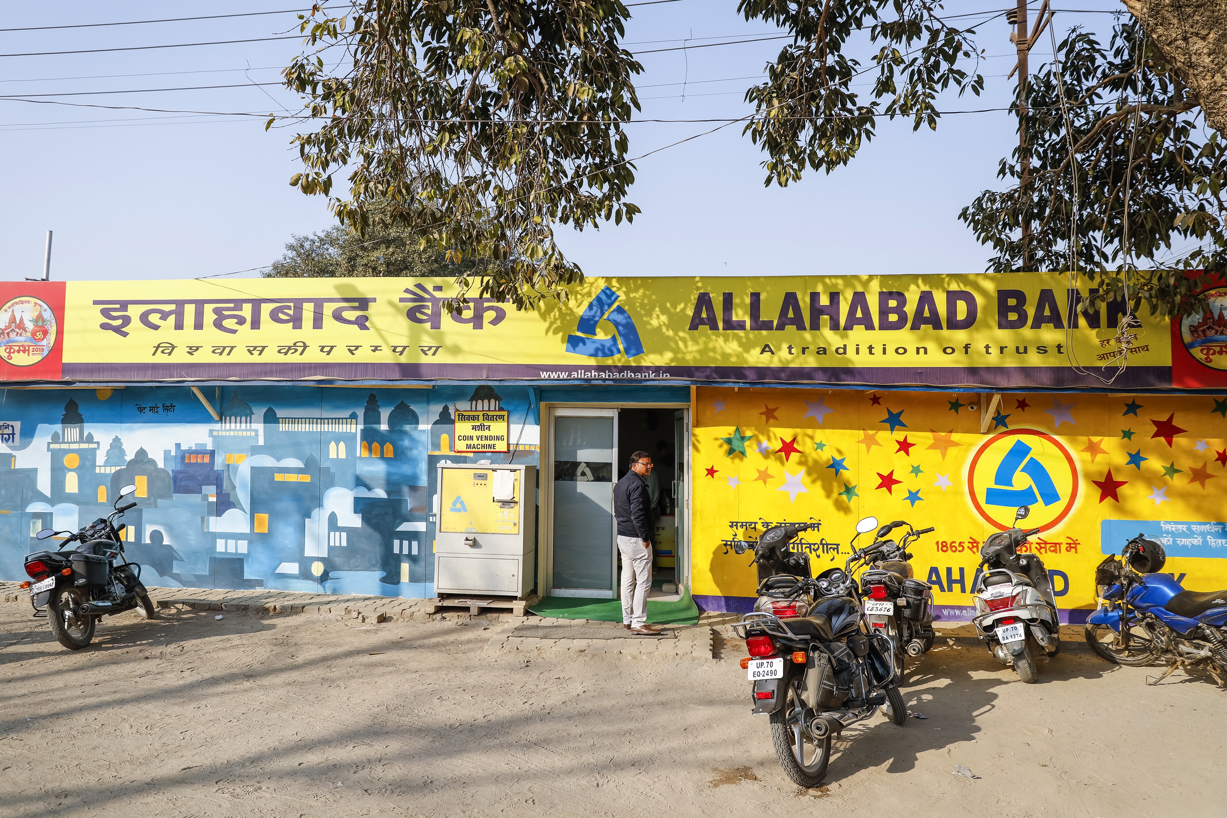 A pilgrim stands at the entrance to a temporary Allahabad Bank Ltd. automated teller machine (ATM) facility during the Kumbh Mela in Prayagraj, Uttar Pradesh. (Photographer: Prashanth Vishwanathan/Bloomberg)