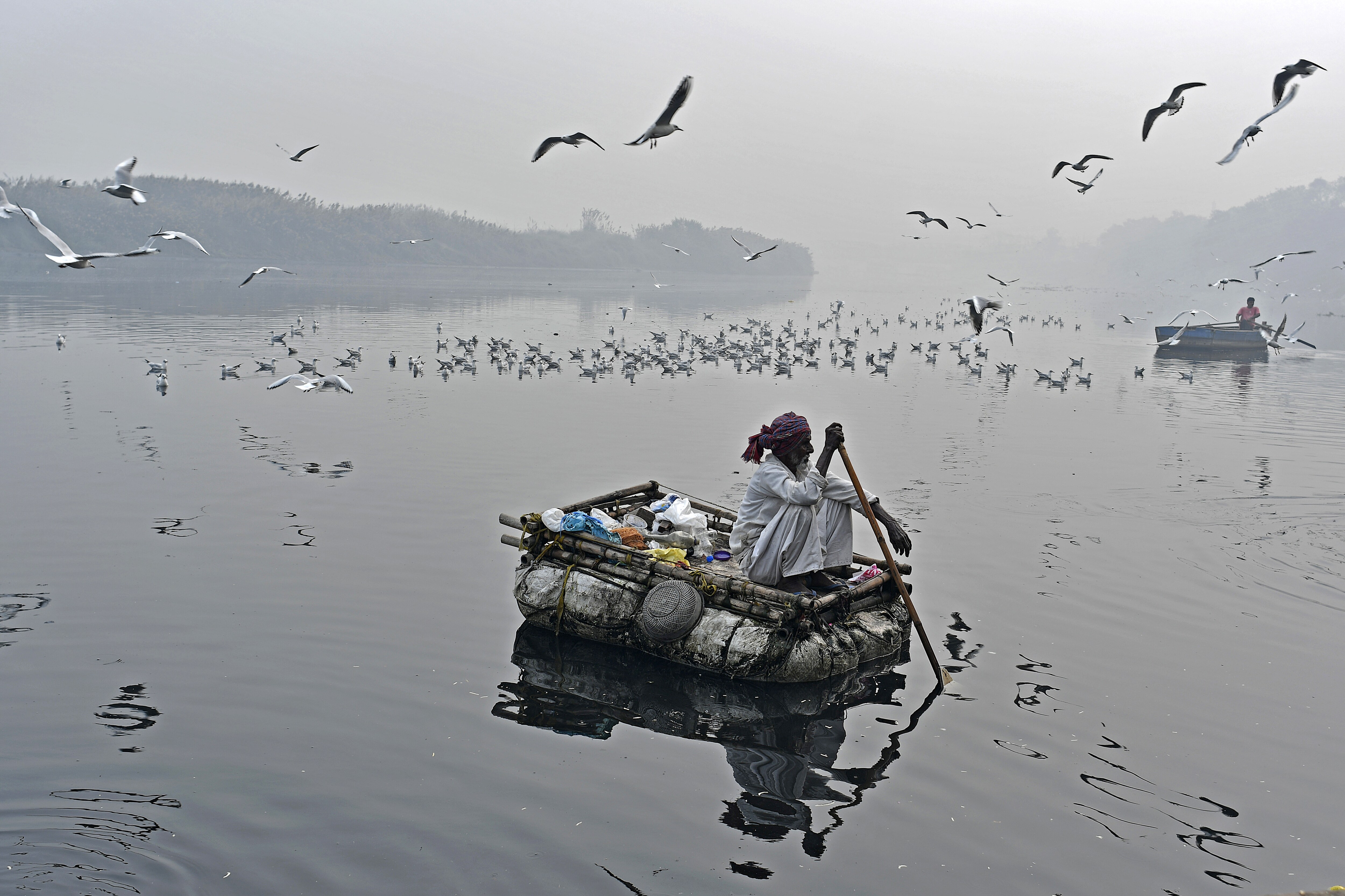 Birds fly over a man sitting on a raft rowing along Yamuna river. (Photographer: Anindito Mukherjee/Bloomberg)