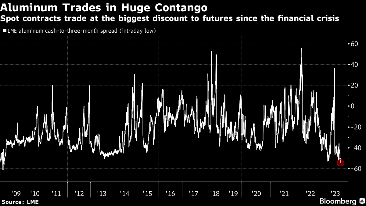 Cash aluminum contracts this week traded at a $54.50 discount to benchmark three-month futures on the LME, the most since 2008, in a condition known as contango that signals supply is overshooting demand in the spot market.