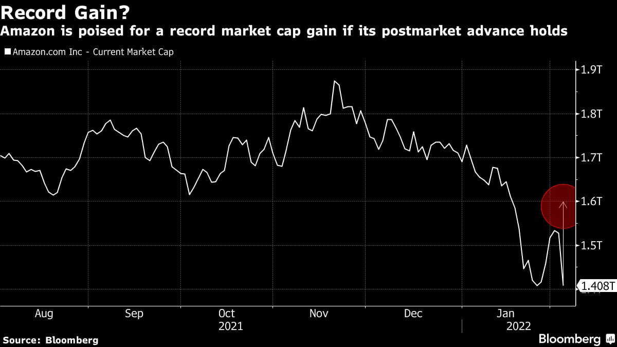 The e-commerce giant is poised to add nearly $200 billion in market value if the stock's 14% gain in after-hours trading following the company's fourth-quarter earnings report holds to Friday's close. That what would be the biggest single-day gain in U.S. stock market history coming just a day after Facebook parent Meta Platforms Inc. entered the other end of the record book with a $251 billion wipeout.