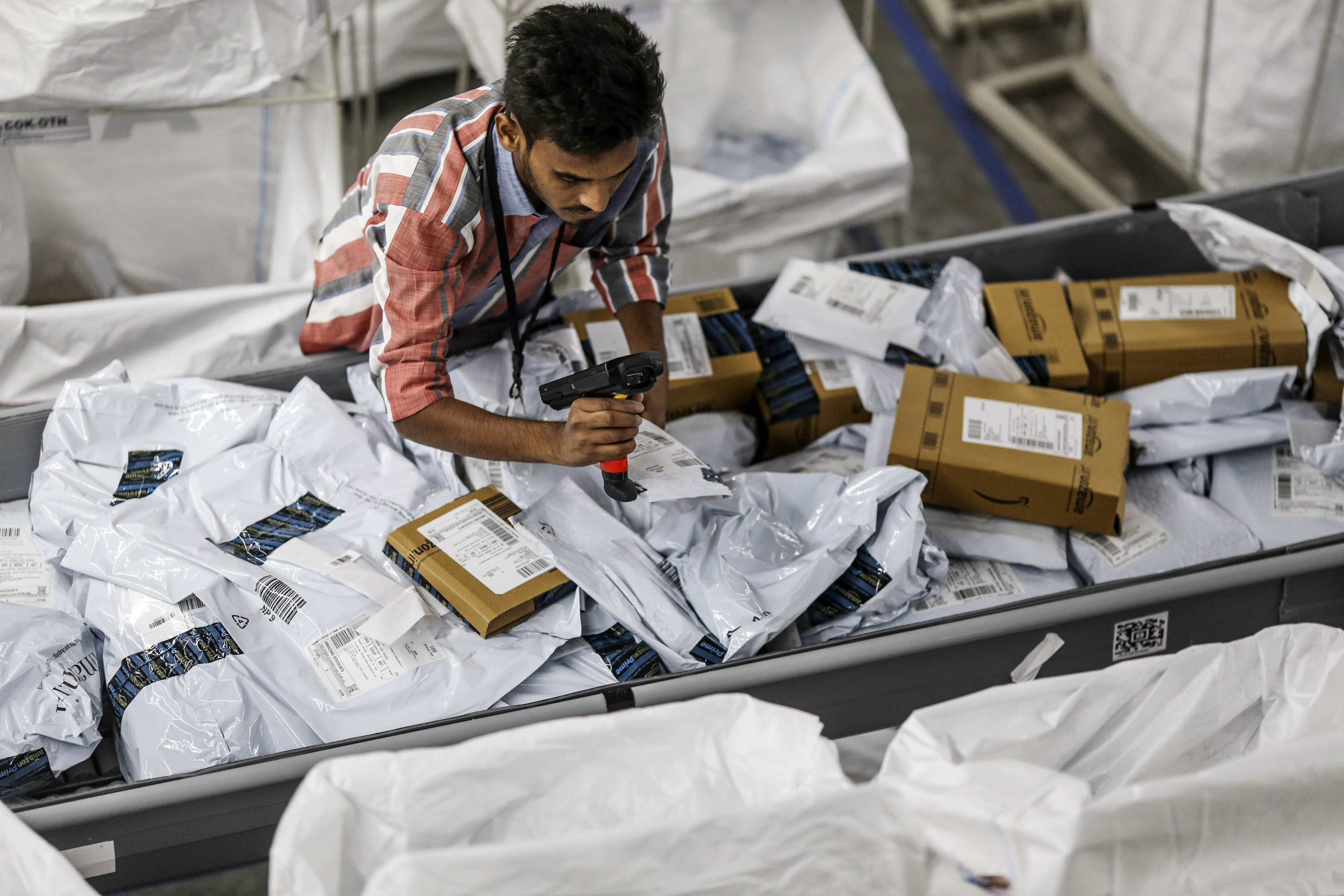 An employee scans a package at the Amazon.com Inc fulfillment center in Hyderabad, India. (Photographer: Dhiraj Singh/Bloomberg)