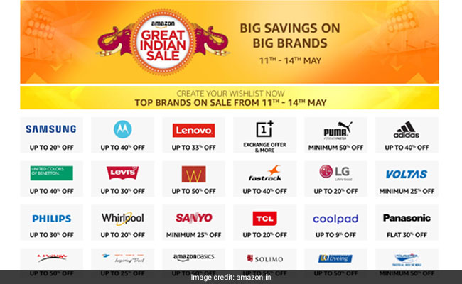 Amazon is offering "big savings" on a variety of brands in its "Great Indian Sales" scheme. The Amazon India sales offer will open from May 11 to May 14. A check on Amazon's website revealed that the e-tailer is offering up to 20 per cent off on Samsung products, while for Motorola and Lenevo products the discounts could be as high as 40 per cent and 33 per cent respectively.