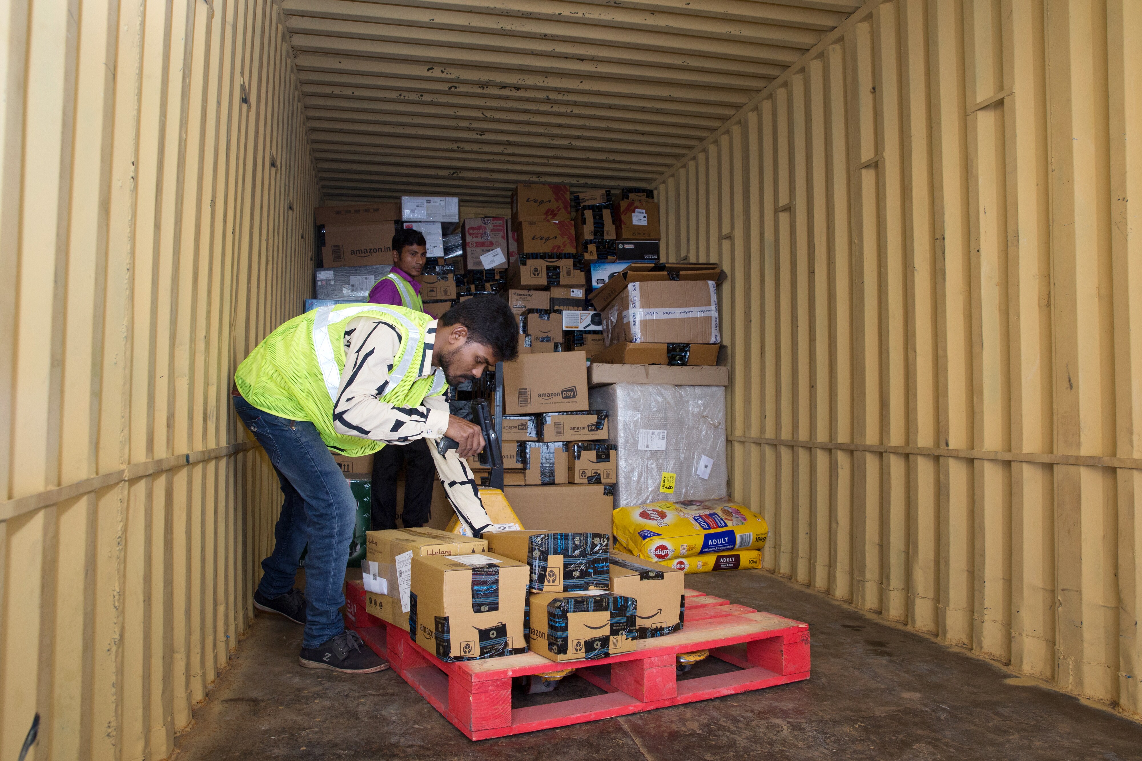Workers scan boxes while loading them on to an outbound truck at the Amazon Inc. fulfillment center in Bengaluru, India. (Photographer: Ruhani Kaur/Bloomberg)