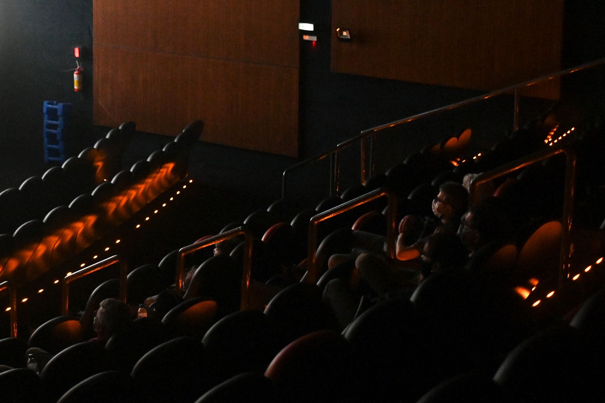 Customers watch a film at a movie theater in Rio de Janeiro, Brazil, on Saturday, Sept. 18, 2021. Rio de Janeiro is requiring proof of vaccination in order to enter public events, touristic points, movie theaters, sports stadiums, and other entertainment activities, as the country sees more than 21 million Covid-19 cases. Photographer: Andre Borges/Bloomberg
