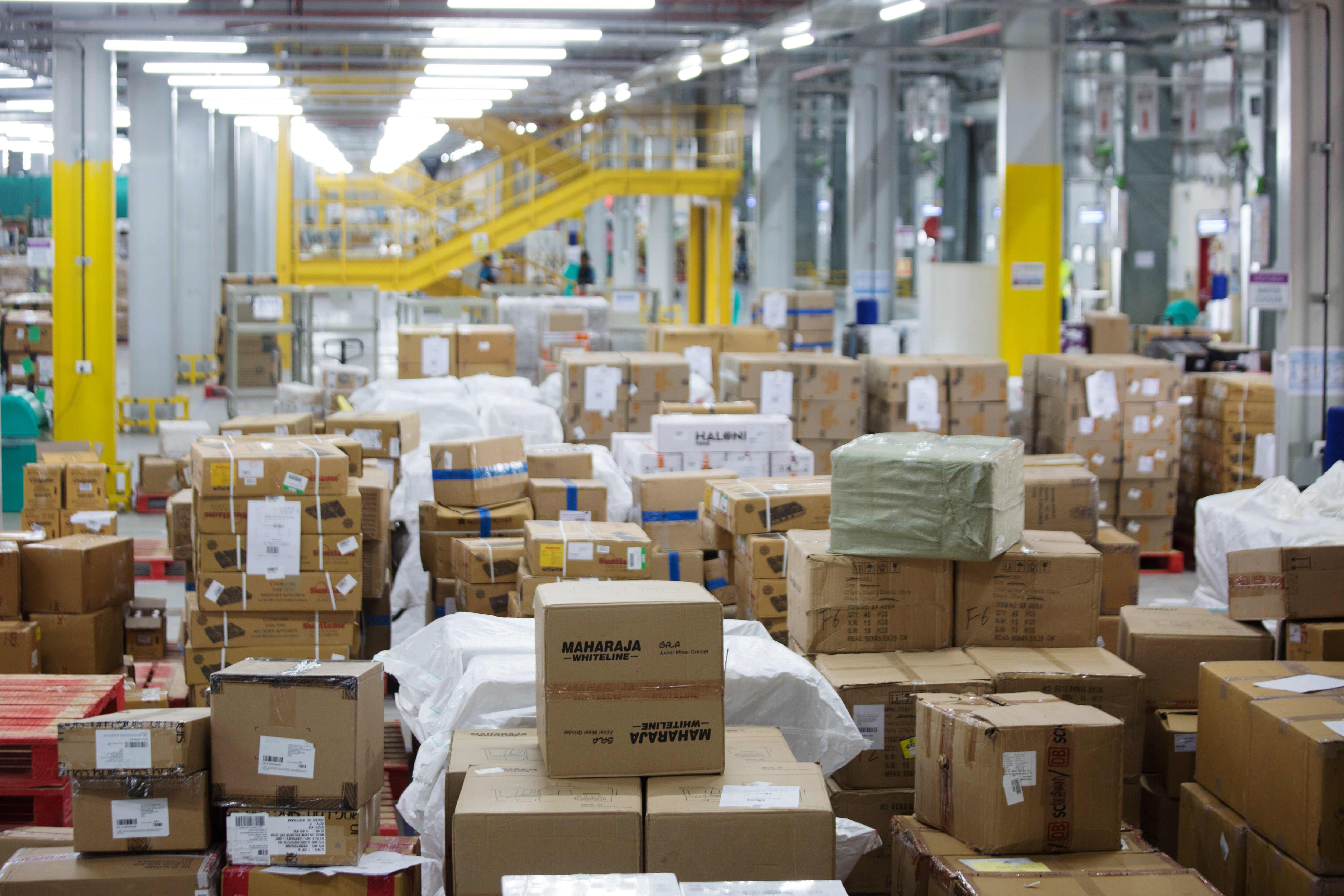 Boxes sit on pallets before being loaded into trucks at the Amazon Inc. fulfillment center in Bengaluru, India. (Photographer: Ruhani Kaur/Bloomberg)