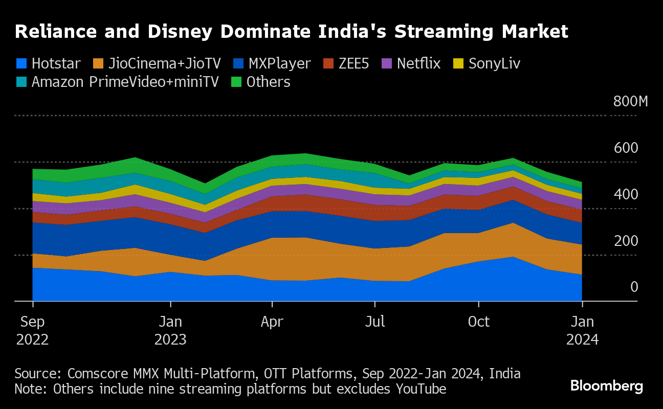 (Bloomberg) -- Nearly half of India's internet users watched movies, television shows, news and sports on streaming platforms owned by Indian billionaire Mukesh Ambani's Reliance Industries Ltd. and Walt Disney Co. before they merged to form a media giant, according to Virgina-based data analytics firm Comscore.