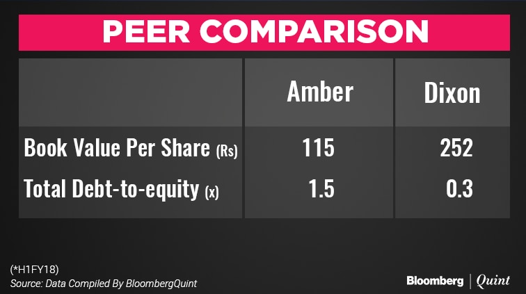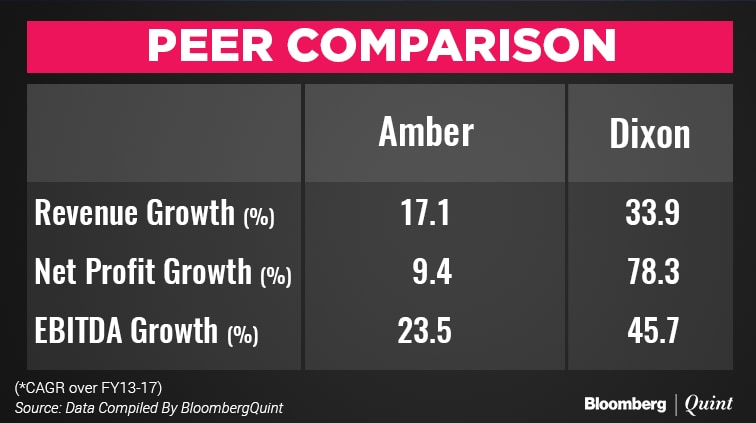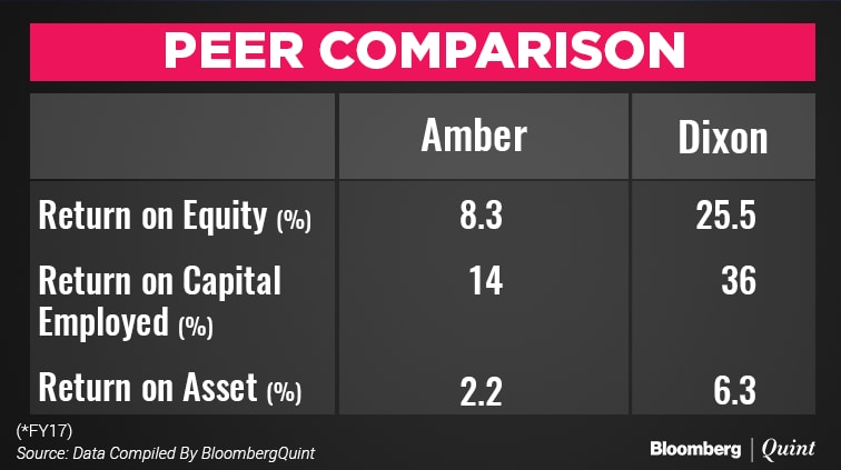 Amber Enterprises has no listed competitors. Dixon Technologies Ltd. has a similar business model but caters to a different market—an equipment vendor for makers of washing machines, LED televisions, lighting products and mobile phones.