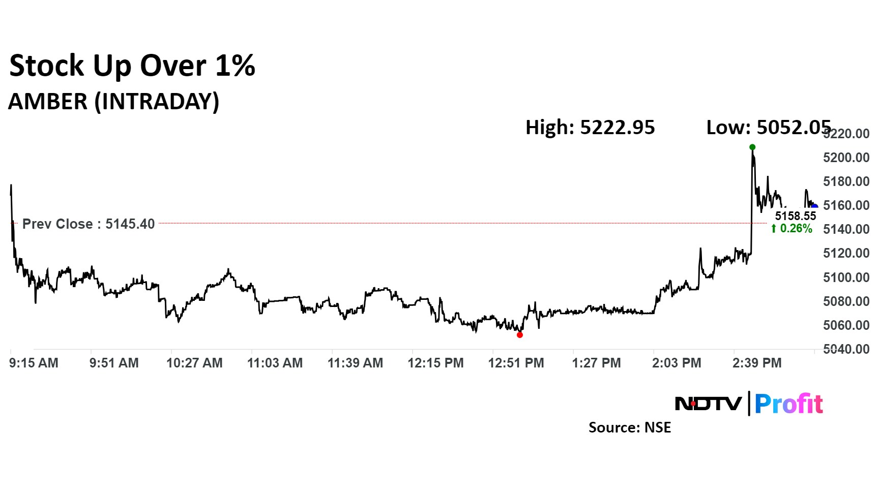 Shares of Amber Enterprises rose as much as 1.51% to Rs 5,222.95 apiece. It pared gains to trade 0.20% higher at Rs 5,155 apiece as of 03:10 a.m. This compares to a 0.28% decline in the NSE Nifty 50 Index.