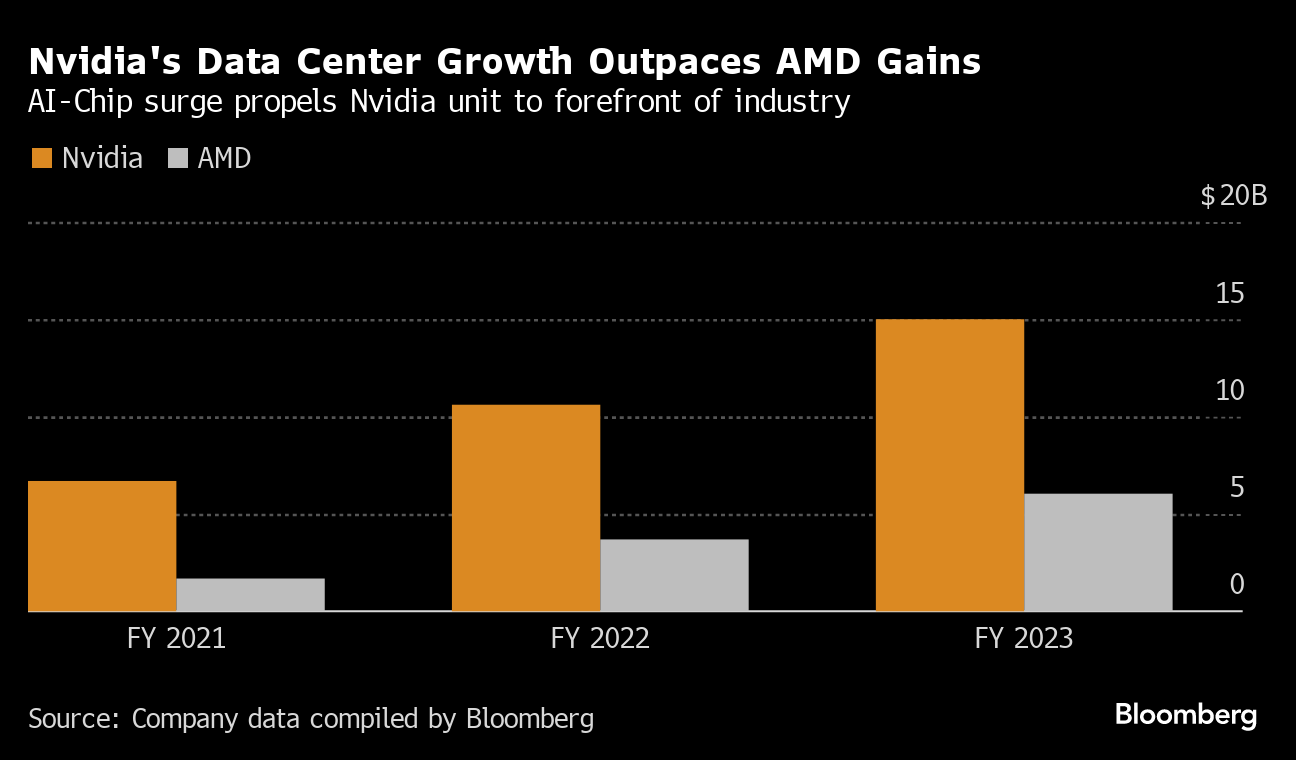 Both chips are used to bombard AI software with data that makes it more effective in a process called training. Nvidia currently owns that market where soaring sales have fueled a nearly two-fold gain in its stock price this year.