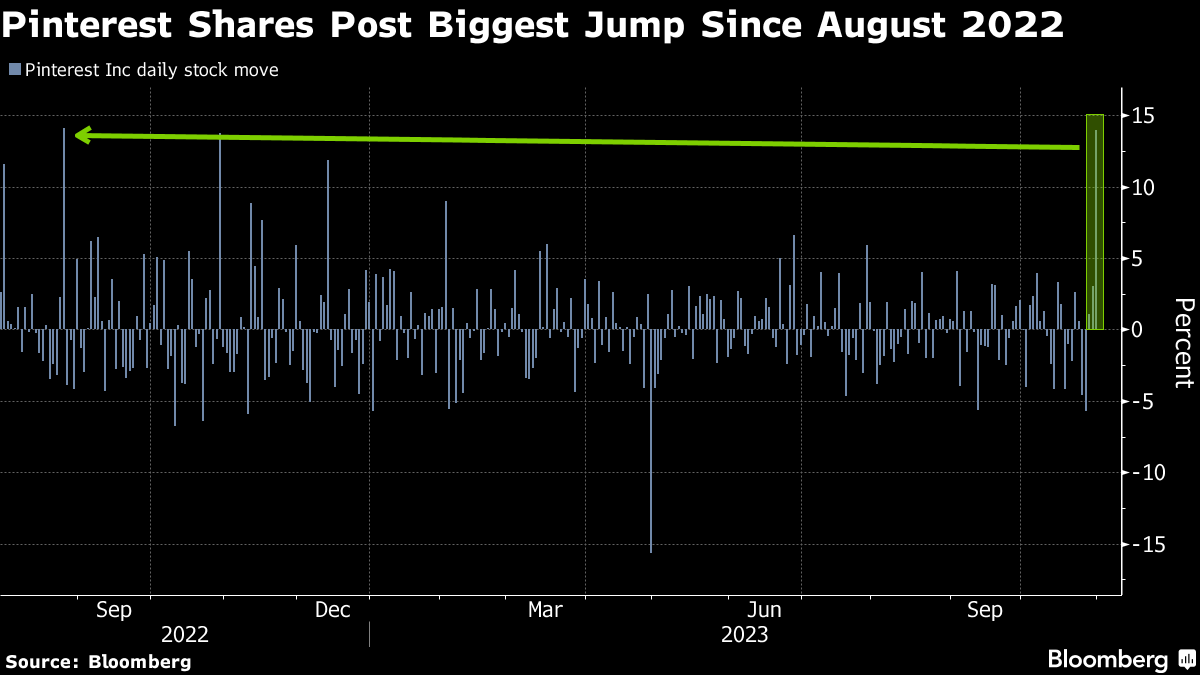 Pinterest Inc. rallied as much as 18% on Tuesday, its biggest intraday percentage gain in more than a year, after the social-networking company reported third quarter results that beat expectations.